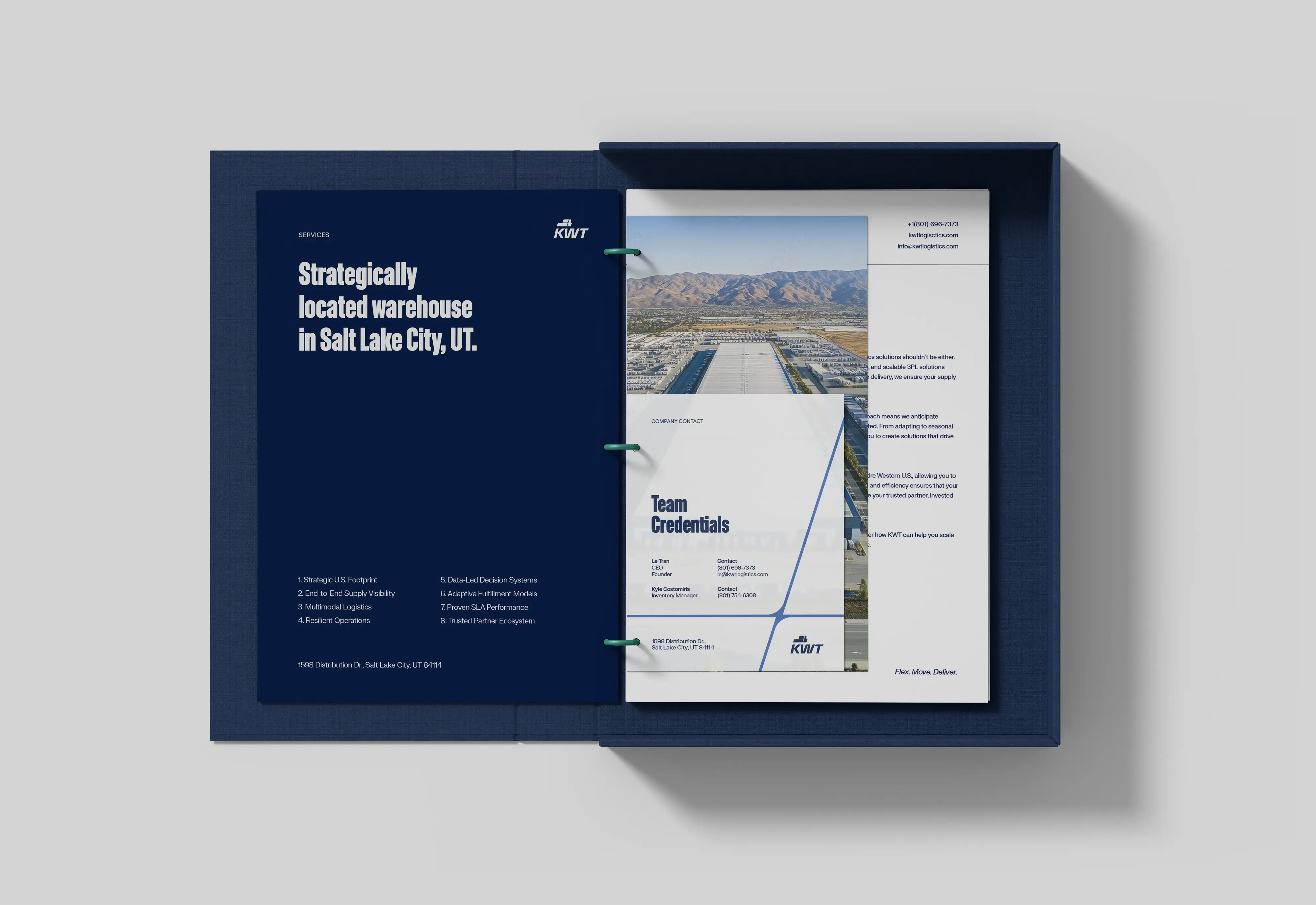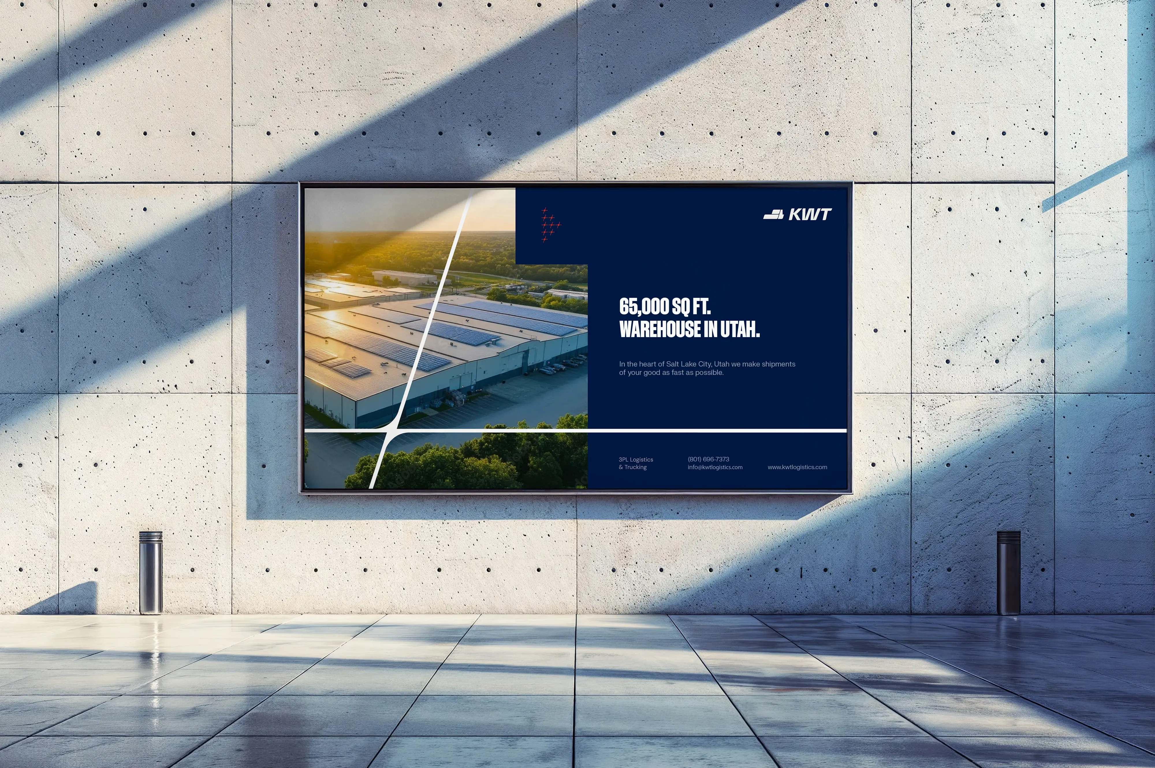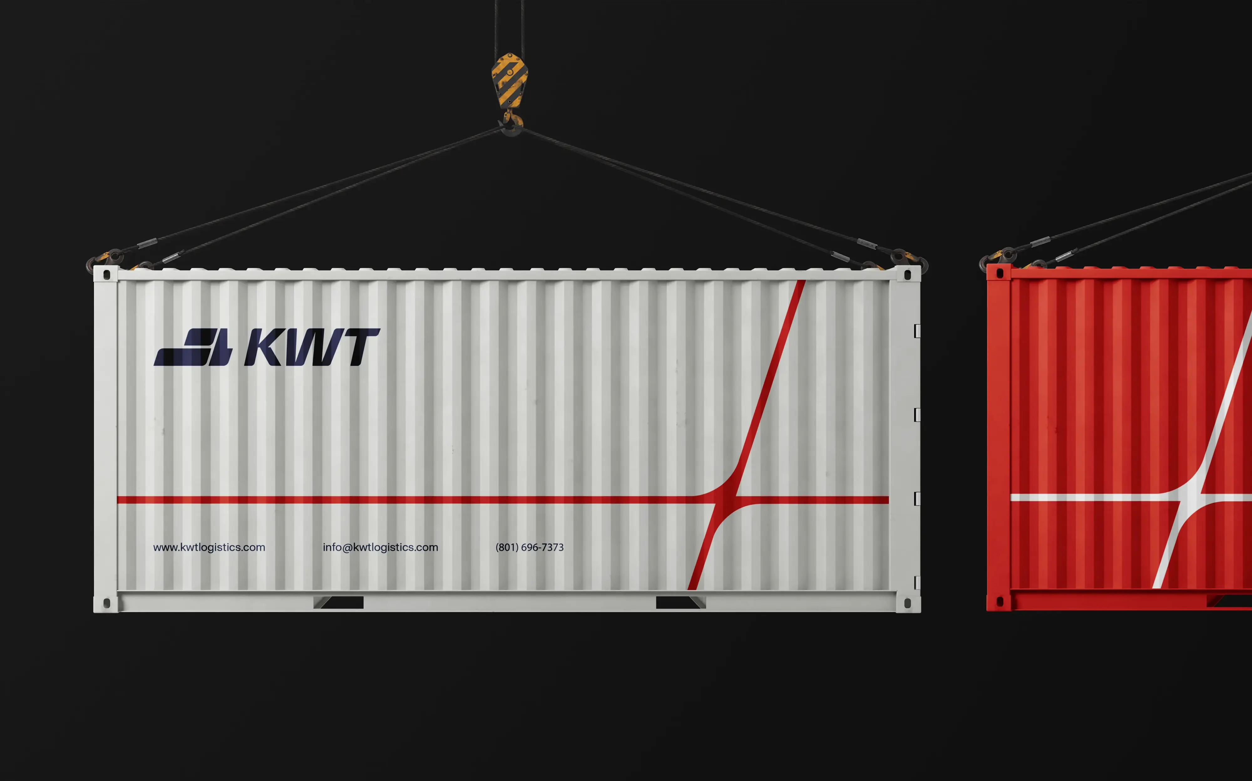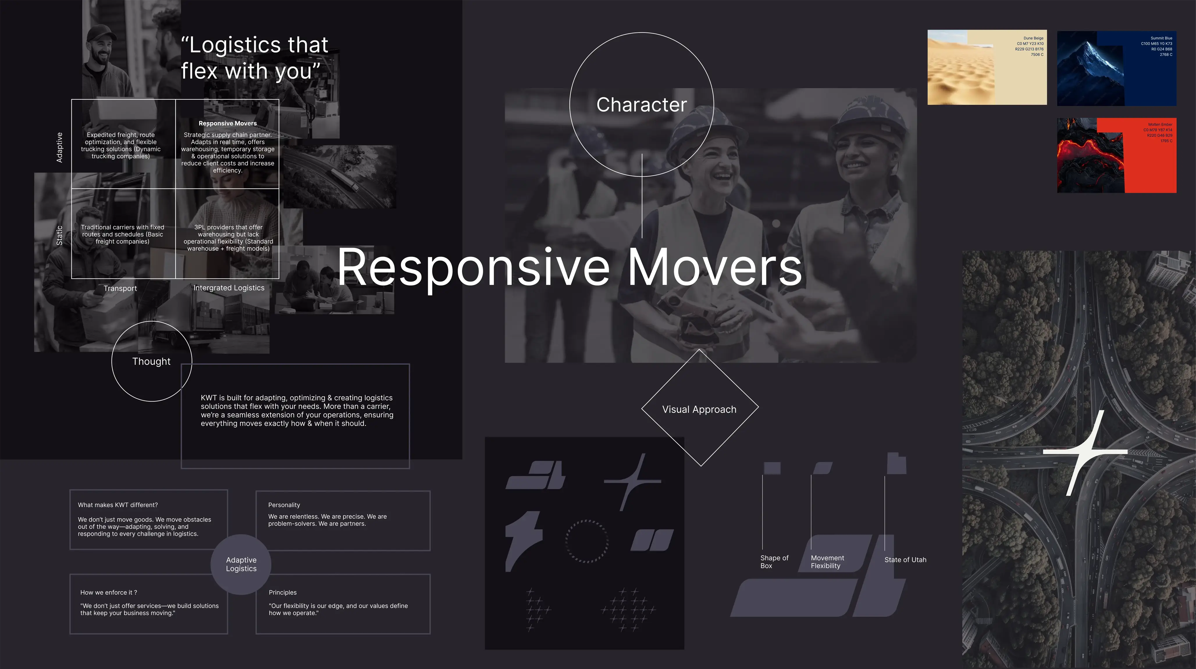 The Flex is KWT Logistics’ core brand expression, rooted in the strategic geography of Salt Lake City, where two of America’s most vital freeways, I-15 and I-80, intersect. These freeways connect the country from Canada to Mexico and coast to coast, forming a powerful logistics backbone. From this infrastructure, we drew a graphic element that began as a simple moving box from the logo.
