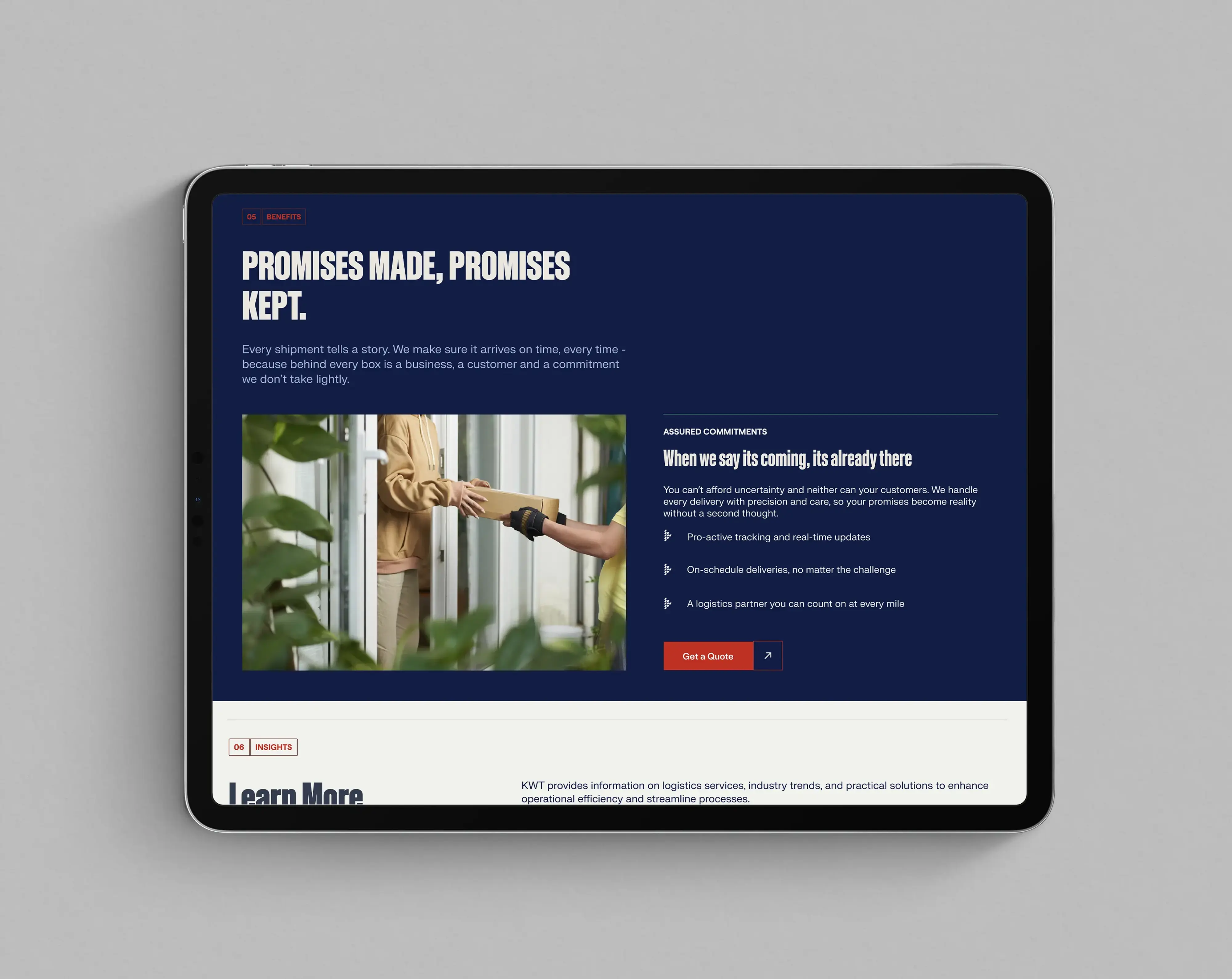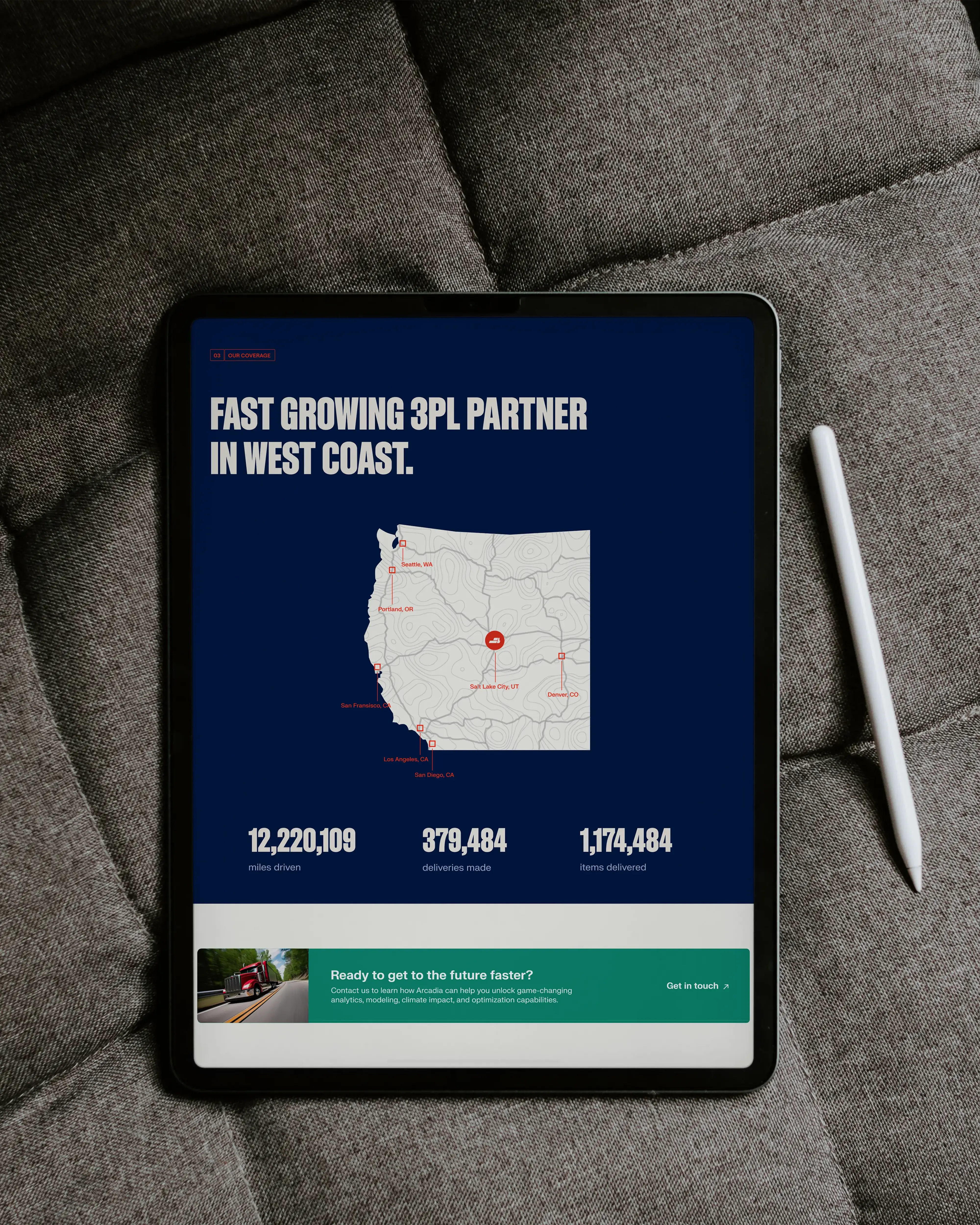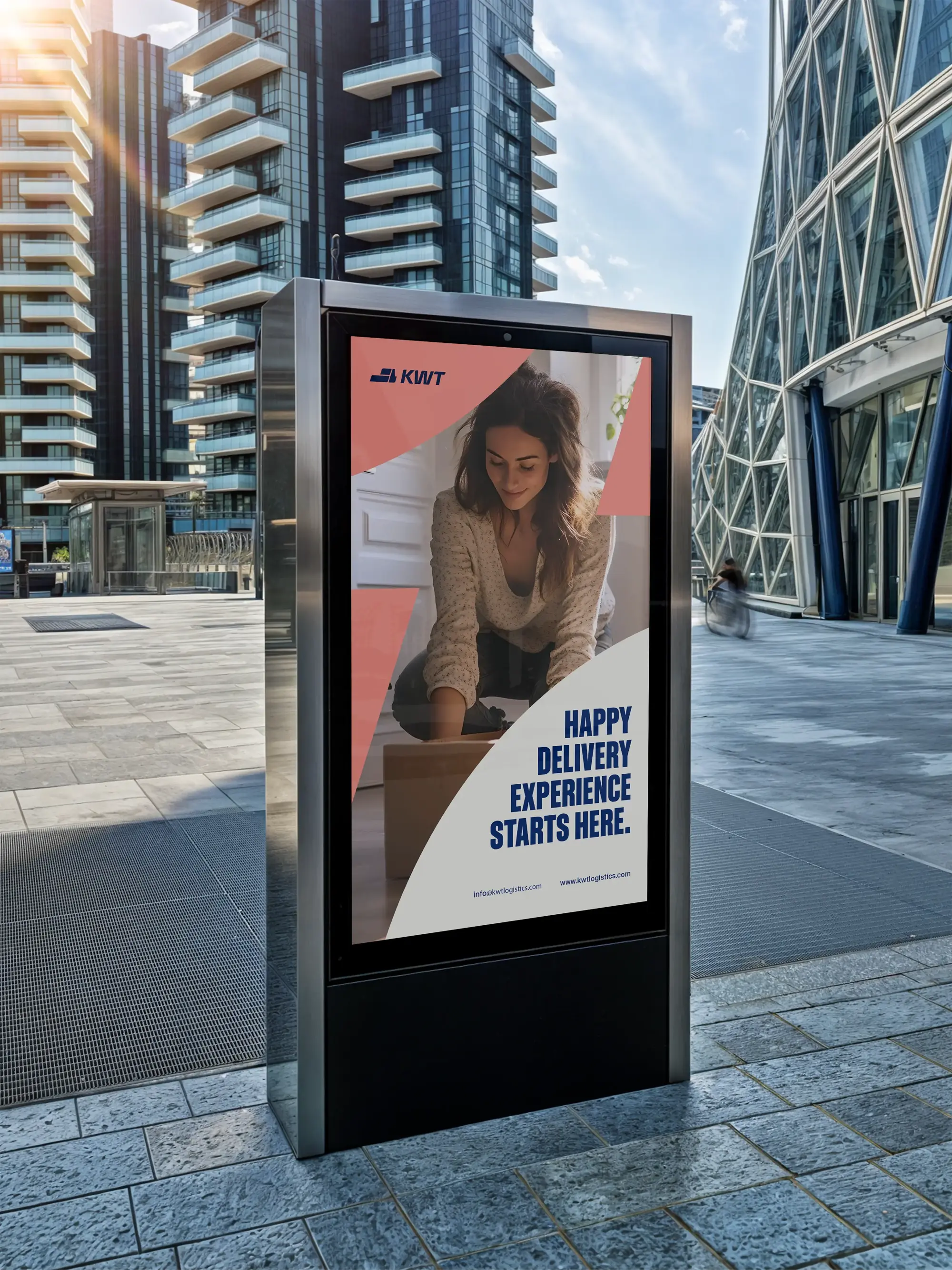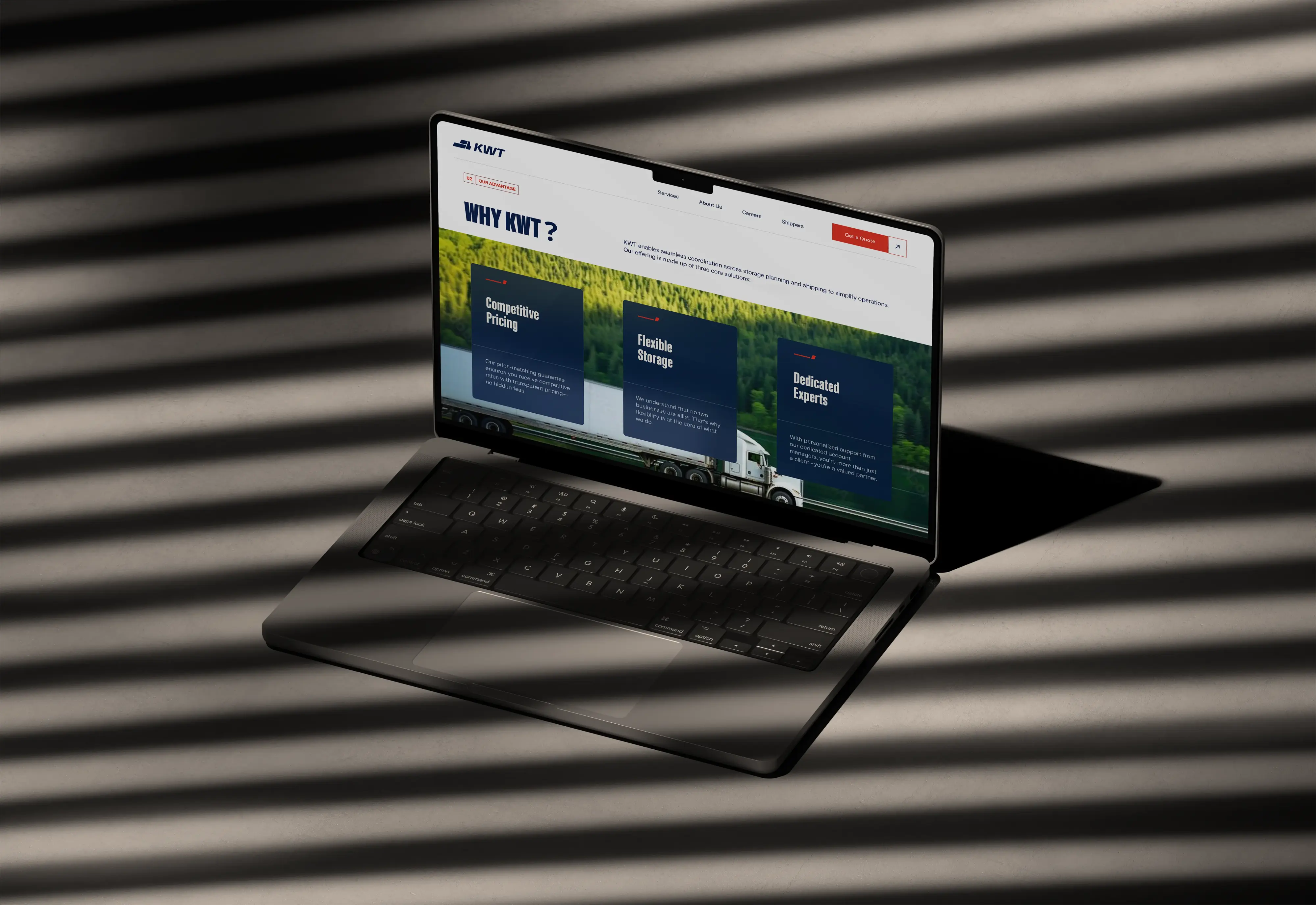 The Flex is KWT Logistics’ core brand expression, rooted in the strategic geography of Salt Lake City, where two of America’s most vital freeways, I-15 and I-80, intersect. These freeways connect the country from Canada to Mexico and coast to coast, forming a powerful logistics backbone. From this infrastructure, we drew a graphic element that began as a simple moving box from the logo.