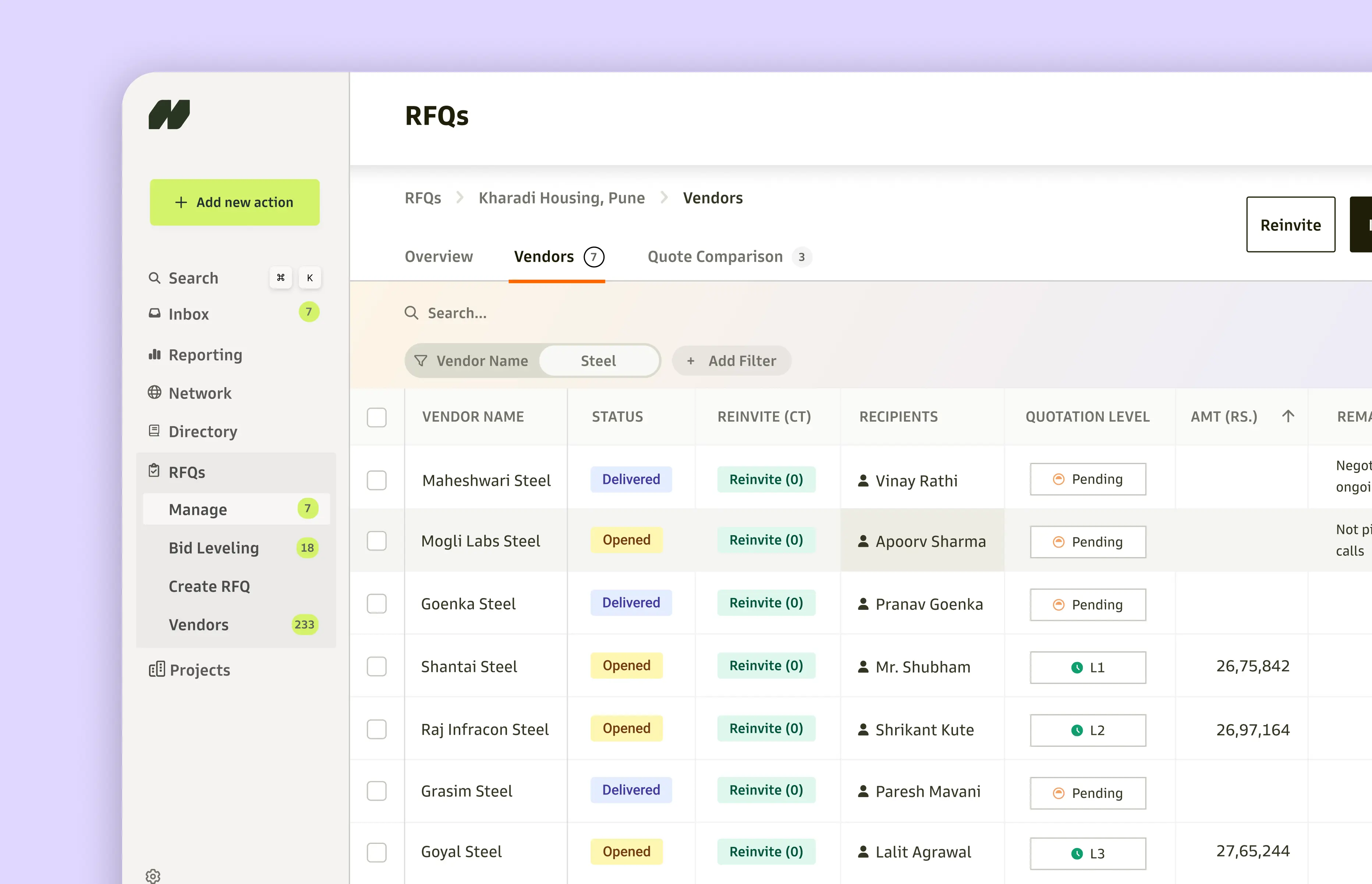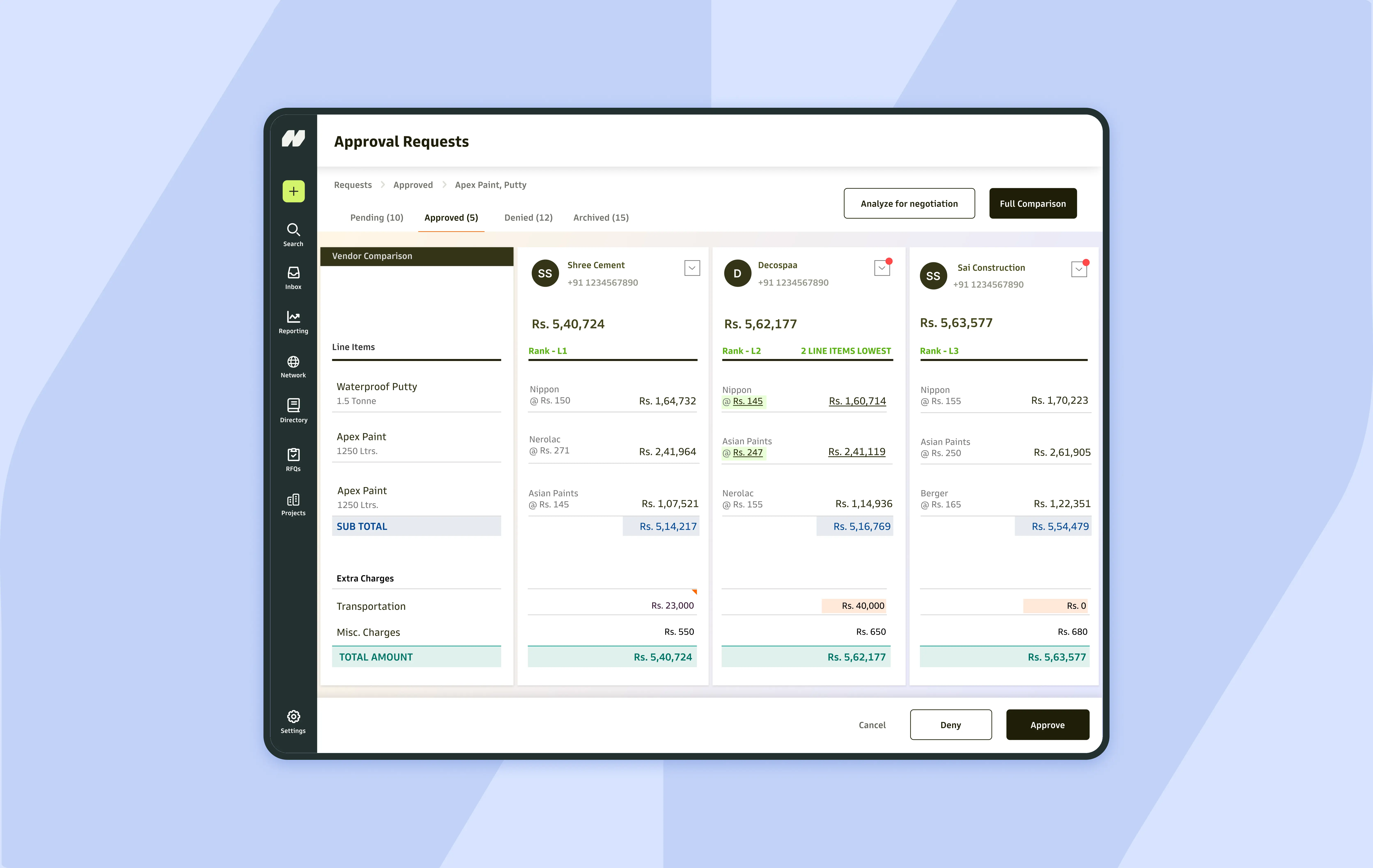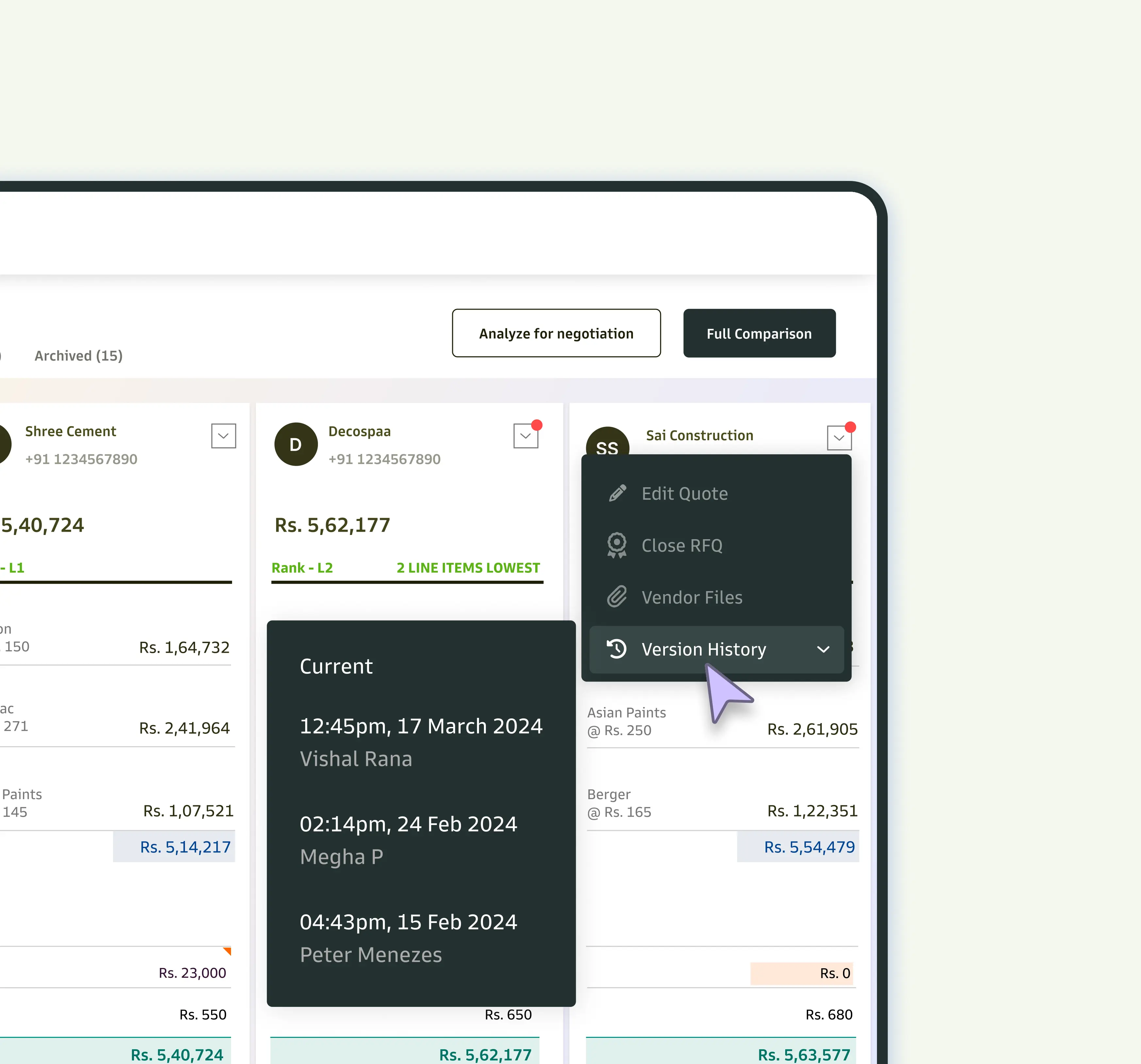 Purchase managers can select vendors, send RFQs, and receive quotes—all within one platform. Neevay automatically ranks vendors by price and highlights line-item differences, revealing when the lowest overall quote (L1) isn’t best for every item.
